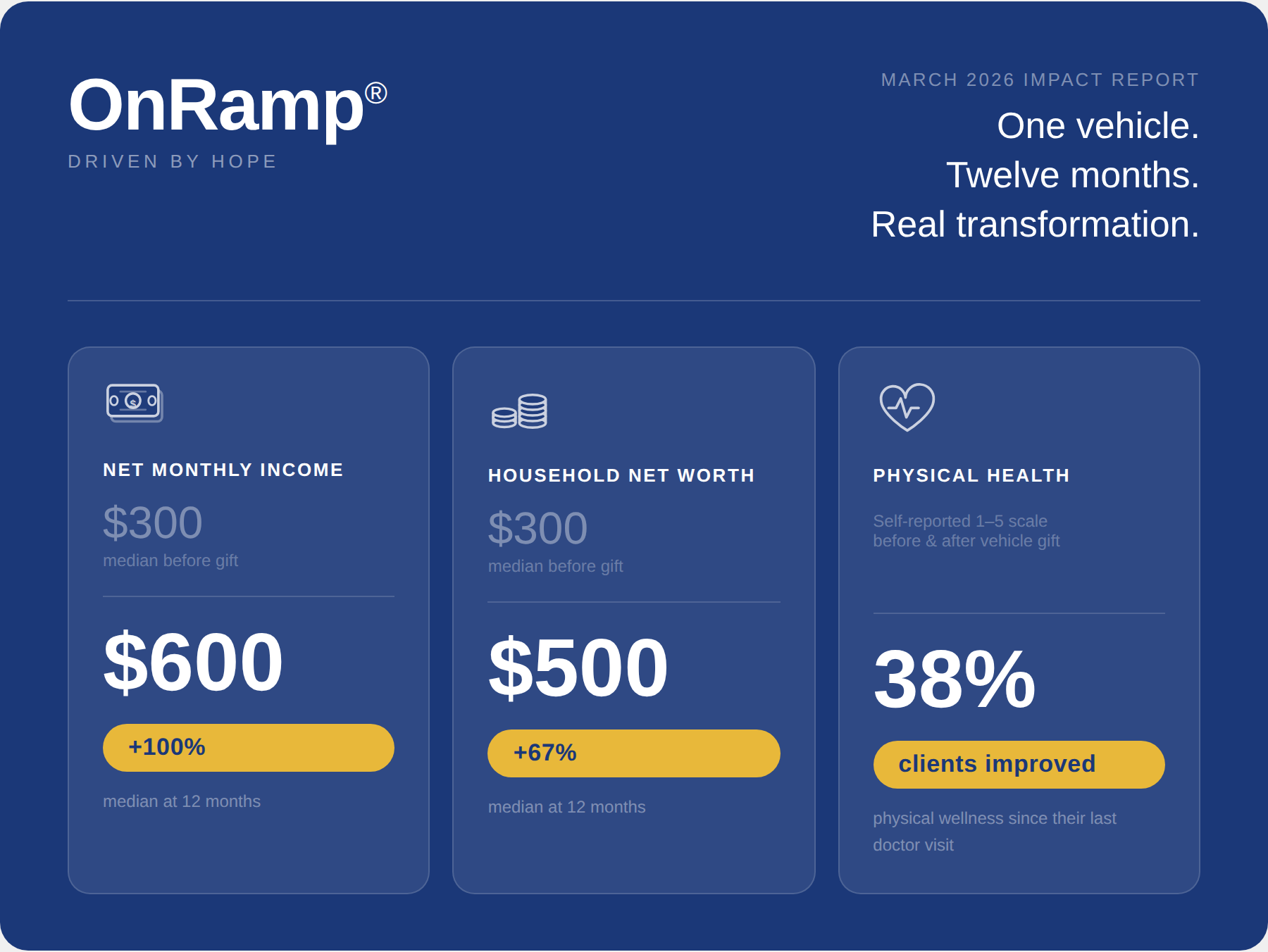 The data also reveals that for most clients, the journey isn’t always linear. At the six-month mark, average income and net worth often dip before they climb. New insurance premiums and new opportunity costs can tax a budget. The early months after receiving a vehicle can be as disorienting as they are hopeful. This is precisely why OnRamp’s model doesn’t end at key handoff. Our one-year free maintenance program, ongoing staff check-ins, and proactive outreach to clients showing signs of financial or emotional struggle are not add-ons; they are the mission. Eight clients in our current year of care have been flagged for follow-up care based on their survey responses. We know their names. We’re reaching out.